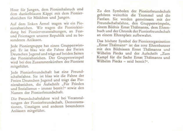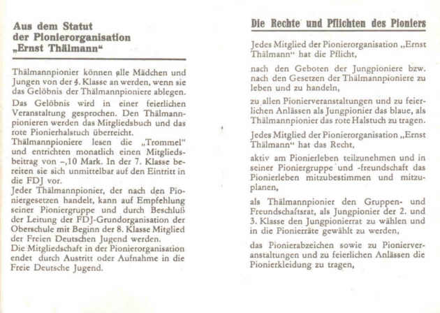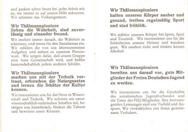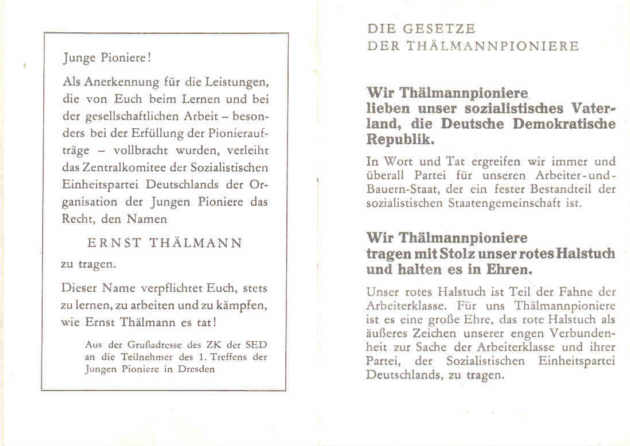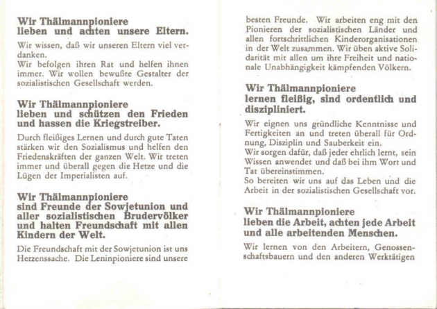 Hier hab ich die Gesetze der Thälmannpioniere für euch mal aufgelistet. Zurück zur Übersicht